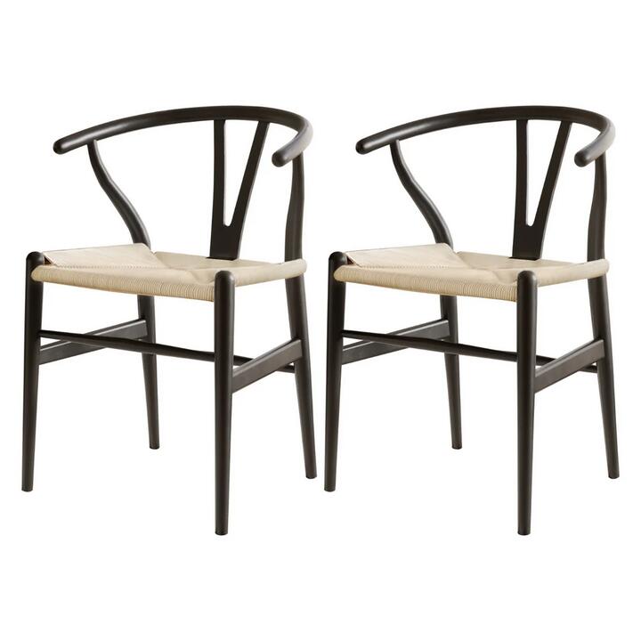 1 Set of 2 Dining Chairs Wooden Rattan Wishbone Black