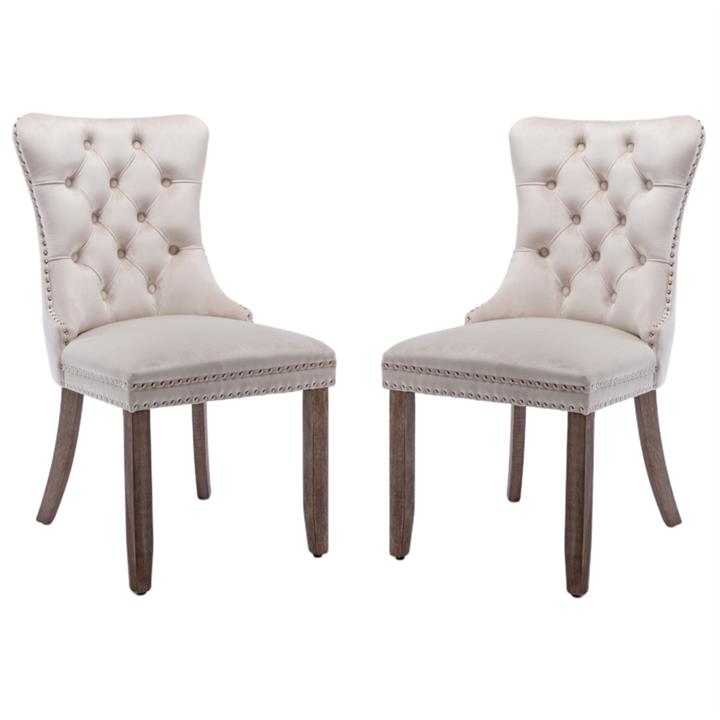 2x Velvet Dining Chairs Upholstered Tufted Kithcen Chair with Solid Wood Legs Stud Trim and Ring-Beige