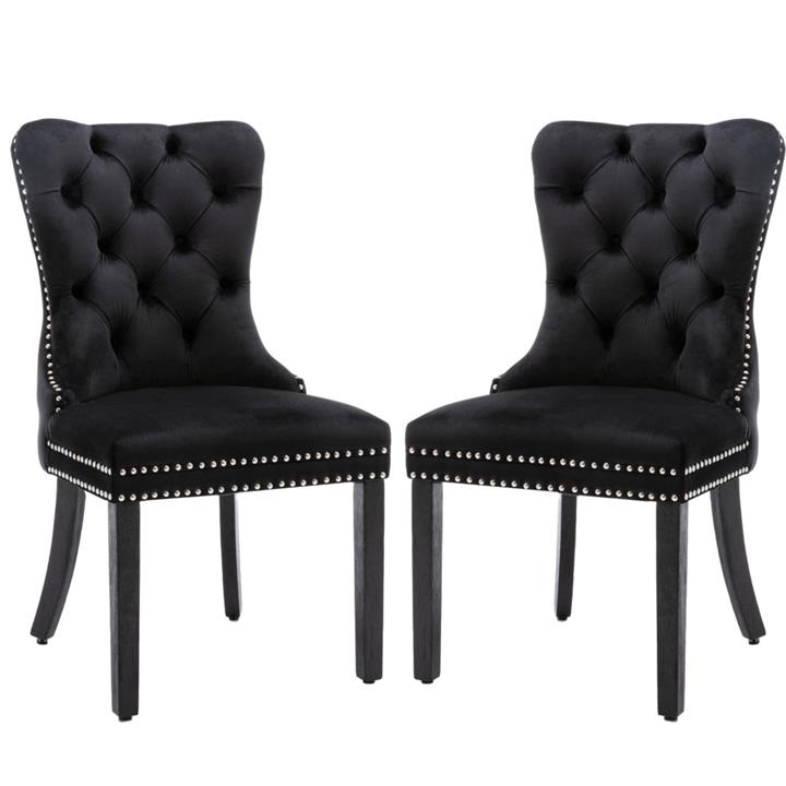 2x Velvet Dining Chairs Upholstered Tufted Kithcen Chair with Solid Wood Legs Stud Trim and Ring-Black
