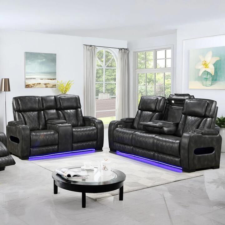 Gorgeous DemeanorEmpire sofa is one of its kind when it comes to aesthetics and gorgeousness. If you are looking for a quality recliner sofa set which will enhance the aesthetics of your living room, then select our Empire sofa set confidently.Supreme QualityPlush and fluffy cushions crafted with high-density foam ensure superior comfort, while Artificial leather upholstery presents an inviting look.Cozy and ComfyThis modern sofa has thick padded back rest and wide and comfortable armrests. The armrests are provided on both sides. Headrest can be adjusted manually to ensure ultimate comfort.Modern AmenitiesEmpire recliner sofa has full length electric recliner. Again, its headrest can be adjusted manually to individual needs. There are USB charging point, cup holders, LED lighting etc. on the sofa. These modern amenities would make your living room comfier and more functional.ResiliencyDetailed and matching stitching is provided on the leatherette upholstery to make the sofa cushions more resilient.Features:Gorgeous Multi-Functional Sofa SetUpholstered in Premium LeatheretteThere are 7 Colors in LED LightPress and Hold the LED Button for 2 Seconds to Choose.Electric Recliner Ensures Comfortable RestingAesthetic Dark Grey ColurUltra Comfort with High Density FoamModern Amenities like USB, Cup Holders etc.Strong and Sturdy ConstructionPlastic Legs in Black ColourSmart Box PackagingSimple Home Assembly RequiredSpecification:Product Dimension (cm): 2R: L-186.7 x W-99 x H-111.7 3R: L-210.8 x W-99 x H-111.7Product Weight (kg): 2R: 114, 3R: 127Product Capacity (kg): 2R: 320, 3R: 450Box Dimensions (cm): 2R: L-212 x W-82.5 x H-66 3R: L-213 x W-82.5 x H-66Box Weight (kg): 2R: 122, 3R: 137Packaging Type: Box PackagingImages are for illustration purposes only. The colours may slightly vary from actual product.Delivery excludes the following postcodes:0801, 0822, 0872 – 0887, 2898 – 2899, 4470 – 4471, 4580 – 4581, 4600, 4650 – 4655, 4819 – 4830, 4850 – 4856, 4858 – 4860, 4870 – 4876, 4878, 4880 – 4881, 4885 – 4895, 5607, 5640 – 5650, 5653 – 5720, 5723 – 5724, 5730 – 5731, 5733 – 5734, 6312, 6315 – 6386, 6394 – 6397, 6409 – 6452, 6462 – 6490, 6512 – 6515, 6517 – 6519, 6522 – 6537, 6574 – 6575, 6605 – 6850, 7255 7257If your postcode is within the above ranges then please contact us for a postage quote.Delivery Receipt Instructions:If damage is evident upon delivery, customers must refuse the freight keeping appropriate proof of arrival with damage. If they do accept the freight, then clearly mark the delivery receipt with D or Damaged to document the condition of the freight.Acceptance of damaged freight without proper documentation may complicate or void the claims process.Estimated delivery time frame is estimates and not a guarantee. Product returns due to minor delivery delays are not possible.