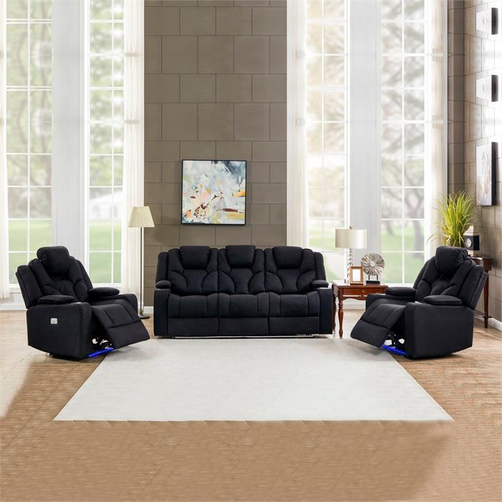 3+1+1 Seater Electric Recliner Stylish Rhino Fabric Black Lounge Armchair with LED Features