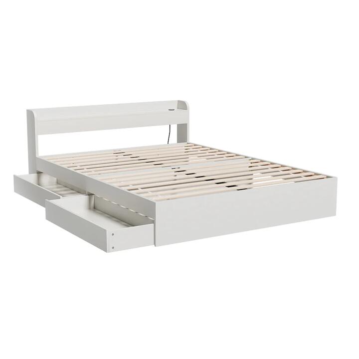 It’s easy to sleep well on the Artiss Aura Bed Frame. Made from thick 15mm and 18mm particleboard with 12mm plywood slats and a white paper finish, the bed frame is designed for long-lasting use and longer-lasting sleep. The thick plywood slats and centre beams provide total support, and noise-free use, and improve the life of your mattress. It features a multifunctional design that allows you to use the bed for storage and to charge your phone overnight. Two drawers with smooth castor wheels can be installed on the left or the right for convenient storage. The headboard has smooth edges and plenty of room for your bedroom essentials. It also features two USB charging ports connected to a 200cm cable for convenience. While you power down for the night, you can power up with the Aura Bed Frame from Artiss.FeaturesMultifunctional designWide storage headboard2 USB charging ports200cm cable2 drawers with castor wheels15mm and 18mm thick board frame12mm thick plywood slatsStrong center support beamsSmooth headboard edgesUnderneath space for storageFits standard Australian mattress sizesEasy assemblySpecifications:Brand: ArtissColour: WhiteFrame material: 15mm and 18mm particleboardSlats material: PlywoodFinish: PaperWeight capacity: 300 kgOverall dimensions: 226 x 160 x 70cmAssembly required: YesNo. of packages: ThreePackage ContentArtiss AURA Bed Frame x 1Assembly Manual x 1This product comes with 1 year warranty