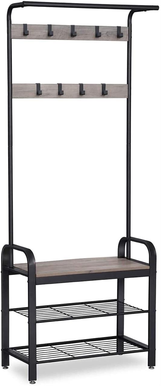 Greige and Black Steel Freestanding Coat Rack Stand with Removable Hooks, Bench and Shoe Rack, Height 183 cm This item stands out for the following characteristics:Something Certain: Some furniture looks good, but isn’t very practical. Others are functional, but look cold and boring. Not this hallway coat rack, however – with rustic, greige wood tones, stable shelves, and numerous coat hooks, you get the best of both worldsPerfect Design: The strong black steel frame and sturdy greige-toned shelf are precisely the elegant mix of styles that give the eye-catching coat stand an individual character, remarkable durability, and high load capacity of up to 3 kg per hook and 80 kg for the engineered wood shelfA Perch For Your Shoes: This hat and coat stand not only has 9 sturdy hooks and a clothes rail at the top, but it also offers two metal wire shelves for shoes and a sturdy bench that you can comfortably sit on while you put them onDon’t Dread The Assembly: Thanks to the easy-to-follow instructions, it takes little effort to set up this 72 x 33.7 x 183 cm coat and shoe rack for your hallwayKey features:Item Dimensions: 72 x 33.7 x 183 cm.Item weight: 9.8 kg.Package Dimensions: 81.8 x 39.2 x 16.9 cm.Package weight: 10.9 kg.The box includes the product, all its components, and a simple set of instructions. One product per package.⚠️ WARNING: Serious or fatal injuries can occur from furniture tip-over incidents.This product must be anchored securely to a wall using appropriate anchoring devices. Follow all safety instructions and do not let children climb on or hang from the unit.