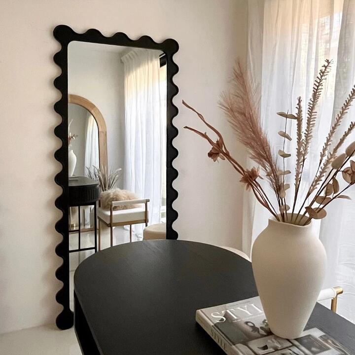 Elevate your space with the Freya Scalloped mirrorwhere timeless sophistication meets contemporary design. Perfect for any room, this mirror features a stunning scalloped edge that adds a touch of refined charm to your decorKey Features:Elegant Scallop Design:The intricately scalloped frame brings a unique, vintage-inspired flair, blending seamlessly with both modern and classic interiors.Full-Length Reflection:At a generous size, it ensures you see your full outfit from head to toe, making it ideal for dressing and grooming.Versatile Placement:Ideal for bedrooms, dressing rooms, or hallways, it complements various styles and spaces.Perfect For:Enhancing your bedroom or dressing areaAdding a touch of vintage charm to modern spacesA stylish, functional addition to your home decorEmbrace timeless beauty and practical design with the Freya Scallop Full-Length Mirror. Transform your space into a haven of style and grace.SpecificationsMeasures: 180cm (h) x 80cm (w)Weight: 16kgBase material: WoodColour: BlackWARNING: Children have died from furniture tipover.ALWAYS secure this furniture with an anchor device; NEVER allow children to stand, climb or hang on drawers, doors, or shelves; Change of Mind Return PolicyAt Interior Ave we strive to ensure our customers are 100% satisfied with their purchase.Faulty or DamagedIn case of shipping damages or errors, please keep the packaging and its contents together.Change of MindWe do not provide a refund on made to order wall art or furniture if you simply change your mind. We ask that you are confident in your item before purchasing.