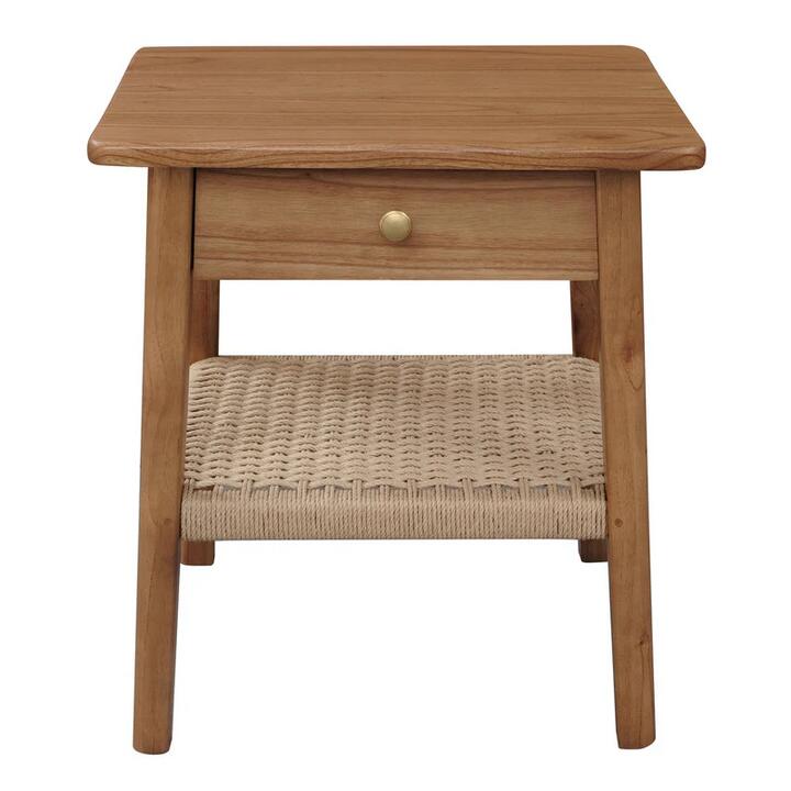 Bring a touch of mid-century style to your space with the Kelly One Drawer Bedside. Made from Solid Mindi timber (White Cedar), this piece showcases the natural beauty of the wood, highlighted by a smooth almond finish that enhances its warm, organic texture. The solid brass handle offers a classic look, while the handwoven loom shelf adds character and provides extra storage. This bedside table comes fully assembled, so it’s ready to use right away. With dimensions of WDH: 50.0 x 45.0 x 55.0 cm, this bedside table combines practical design with a style that suits both modern and mid-century-inspired interiors.Dimensions: 50.0 x 45.0 x 55.0 cmInternal Drawer Dimensions: 27.5 x 25.5 x 6.5 cmShelf Height: 20.0 cmNet Weight: 16.0 kgComposition: Solid White Cedar Wood, Loom and Solid BrassAssembly Required: None