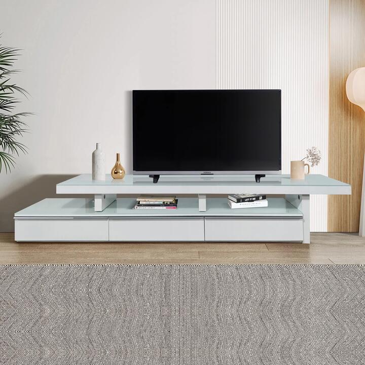 Elegant LookThe glossy finish and sturdy construction make it a worthy addition in your living space. The top of the MarlinTV cabinet is polished to perfection with a shiny Black/White finish and thick tempered glass shelf is added for a premium feel. It is made from premium MDF board which ensures sturdy construction. It provides adequate space and the top is expansive to accommodate almost any television unit. This TV Cabinet will make a stylish living room or bedroom centrepiece, while effortlessly blending within any style of home interior.Ample Storage CapacityThe entertainment unit comes with storage tiers for stowing your accessories along with your entertainment consoles. There are three drawers and on top of it there are storage shelves. Slim yet spacious design accommodates both LCD and Plasma screens and most AV equipment, including set-top box, DVD/Blu-ray player, games consoles, DVDs, CDs etc. You can also use the shelves as display corners to enhance the look of your living room.Length Adjustment FacilityThe length of the cabinet is adjustable upto 2.7 to 4.2 meter. The upper portion of the cabinet can be detached and placed beside the main unit which will make it 4 meter long. You can see the picture at your left for better understanding the function.Key Features:?Elegant Slimline Design TV Unit?Length Adjustment between 2.7 and 4.2 m?Black/White High Gloss Paint on MDF?Strong and Sturdy Construction?3 Drawers with Ample Storage Space?Metal Slide Runner on Drawers?Storage Tier Allow for Organizing Accessories?Thick Tempered Glass Shelf?Smart Flat Pack Box Packaging?Home Assembly RequiredProduct Specifications:?Product Dimension: L-277to 420 (Expandable)x W-45 x H-45cm?Box Dimension (cm): Box 1: L-247 x W-55 x H-30? Box 2:L-247 x W-53 x H-13?Product Weight: 110kg??? Box Weight (kg): Box 1- 65, Box 2- 47?Packaging Type: FlatpackImages are for illustration purposes only. The colours may slightly vary from actual product.Delivery excludes the following postcodes:0801, 0822, 0872 – 0887, 2898 – 2899, 4470 – 4471, 4580 – 4581, 4600, 4650 – 4655, 4819 – 4830, 4850 – 4856, 4858 – 4860, 4870 – 4876, 4878, 4880 – 4881, 4885 – 4895, 5607, 5640 – 5650, 5653 – 5720, 5723 – 5724, 5730 – 5731, 5733 – 5734, 6312, 6315 – 6386, 6394 – 6397, 6409 – 6452, 6462 – 6490, 6512 – 6515, 6517 – 6519, 6522 – 6537, 6574 – 6575, 6605 – 6850, 7255 7257If your postcode is within the above ranges then please contact us for a postage quote.Damaged Delivery Receipt Instructions:If damage is evident upon delivery, customers must refuse the freight keeping appropriate proof of arrival with damage. If they do accept the freight, then clearly mark the delivery receipt with D or Damaged to document the condition of the freight.Acceptance of damaged freight without proper documentation may complicate or void the claims process.WARNING!Children have died from furniture tipover.ALWAYS secure your television with an anchor device.NEVER allow children to stand, climb or hang on drawers, doors or shelves.Place heavy items down low.