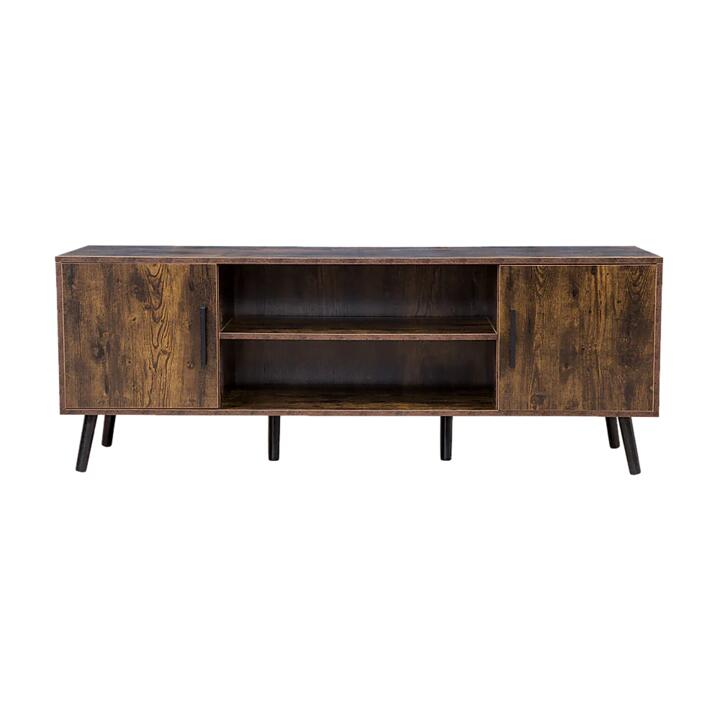 Enhance your living room with our exquisite TV stand. This stylish piece features closed storage compartments on both sides, providing ample space for your media essentials or decorative items, whether placed in your living room or bedroom. The sleek metal hardware, angled legs, and boxy frame harmoniously blend to create a captivating mid-century modern aesthetic.The adjustable shelves allow for customization according to your needs, while the adjustable rubber feet prevent any unwanted sliding, ensuring stability.This TV stand is well-suited for accommodating up to a 55 TV, making it a perfect fit for your entertainment needs. Its dark walnut finish adds an elegant touch to your space.Crafted with attention to detail, this TV stand is not only functional but also aesthetically pleasing. It showcases a mid-century modern design style that effortlessly elevates the ambiance of your living room, bedroom, or home office while providing extra storage space.Included with the stand is the necessary hardware for assembly, ensuring a hassle-free setup. Discover the perfect balance of style and functionality with our exceptional TV stand, complete with open and closed storage compartments, a center tempered glass shelf, and adjustable shelving.Specifications:Colour: Dark WalnutMaterial: Wood with metal hardwareDimensions: 150 x 40 x 55cm (LWH)Max Weight Capacity:35kg***WARNING! Children have died from furniture tipover.***ALWAYS secure your television with an anchor device.NEVER allow children to stand, climb, or hang on drawers, doors, or shelves.Note: COM (change of mind) Return Policy: The product must be unopened and in brand new condition, with the return to be organised by the customer. Once received and verified to be in the condition specified, refund is only of the item value minus 15% restocking fee (not including initial shipping). An additional return charge, which is same cost as that of initial shipping, will be deducted from the refund on returns due to delivery failure caused by customer error. For the health and safety of our staff and other customers, we are unable to accept returns of personal use items.